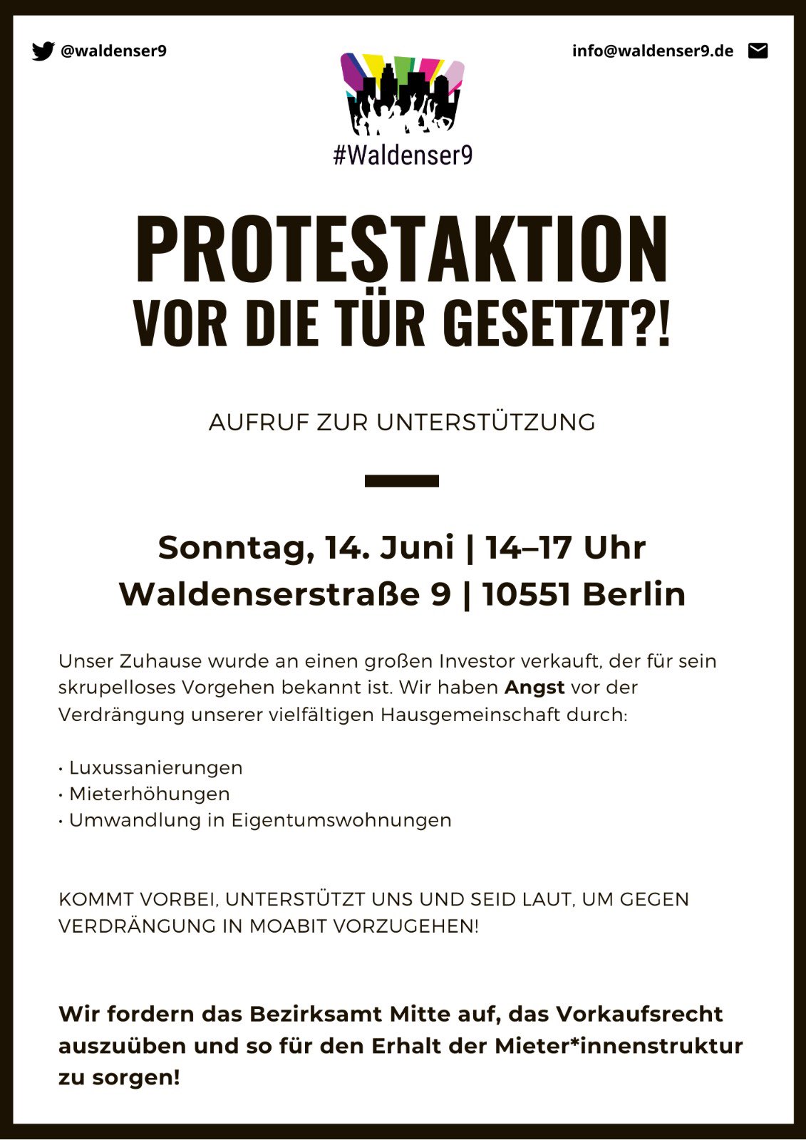 Die Mieter*innengemeinschaft der Waldenserstraße 9 in Moabit hat für Sonntag, den 14. Juni 2020 von 14 bis 17 Uhr eine Demonstration unter dem Motto „Vor die Tür gesetzt?!“ angemeldet, um auf die Dringlichkeit der Ausübung des Vorkaufsrechts durch den Bezirk Mitte von Berlin aufmerksam zu machen.