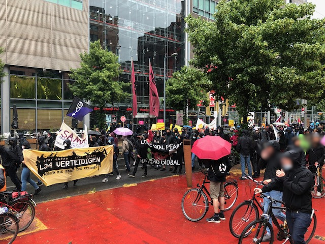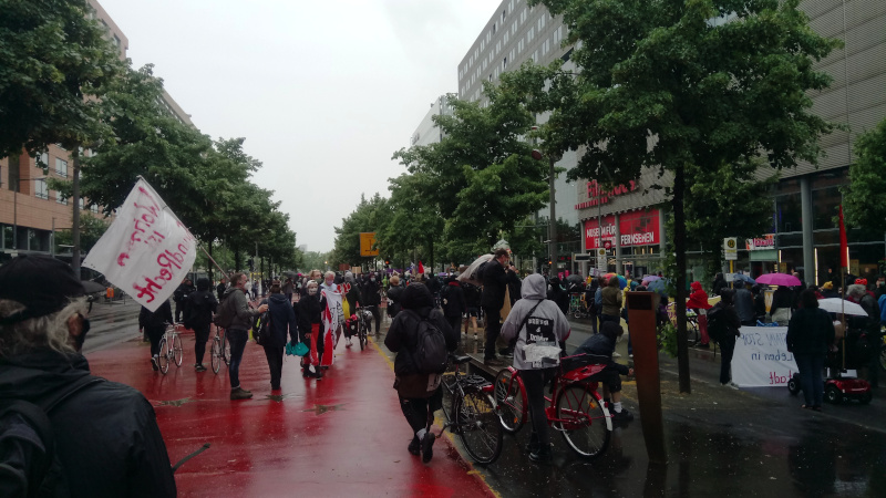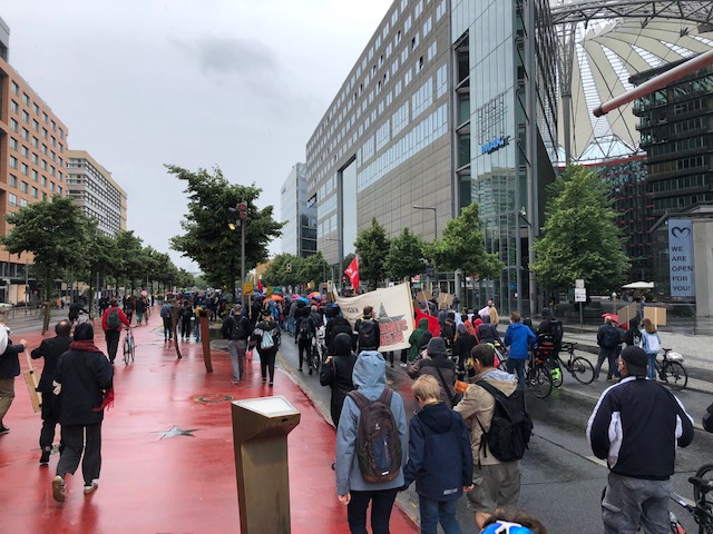 Kollektive besetzen ihre Räume, sie gehen ins Exil, halten weiter den Betrieb aufrecht, sie zeigen sich an Tagen wie diesem. Der Startpunkt der Demo ist der Potsdamer Platz, ein Sinnbild des neuen kalten Berlin, aber auch günstig gelegen, um drei Zubringerdemos aus Wedding, Neukölln und Kreuzberg zu vereinen. Nicht von ungefähr geht es vom Potsdamer Platz Richtung Schöneberg: Dort sind bzw. waren die Jugendclubs Potse und Drugstore angesiedelt, deren Schicksal ungewiss und deren Durchhaltevermögen bewunderswert ist. Viele bedrohte Porjekte der linken Berliner Szene haben sich am heutigen Tag erstmals nach dem Corona-Lockdown wieder zu gemeinsamem Protest zusammengefunden.