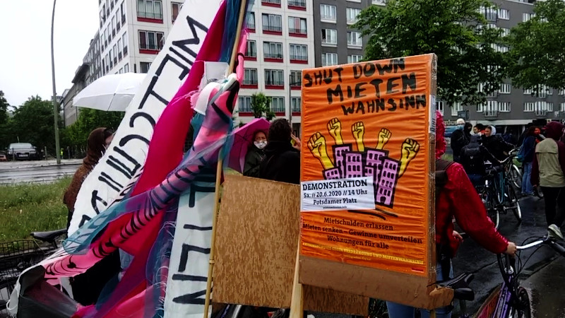 Berlin, 20. Juni 2020. Die Infektionszahlen steigen in der Hauptstadt seit einigen Tagen wieder an. Die erste große Mietendemonstration nach dem Corona-Lockdown findet bei strömendem Regen statt. Trotzdem kommen mehrere tausend Menschen zusammen, um gegen den anhaltenden Mietenwahnsinn zu demonstrieren und die überwiegende Mehrzahl hält sich an die Empfehlung, Mund- und Nasenschutz zu tragen.