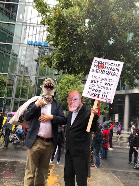 Wir können vom Endpunkt der Demo zu Fuß nach Hause gehen – in sehr nachdenklicher Stimmung tun wir das.. Was wir seit Monaten befürchten, tritt ein: Gewiss hat Corona auch eine Art von Atempause gewähnt, dafür aber schlägt der Mietenwahnsinn nun umso härter zu, wie viele Verkaufsvorgänge zeigen, die in den letzten Wochen bekannt wurden und gegen die sich Mieter*innen nun wehren. Die Berichte darüber werden künftig bei uns wieder einen großen Raum einnehmen. Das ergibt sich aus der Sachlage. Weiterer Text findet sich in Form von Bildbeschreibungen.