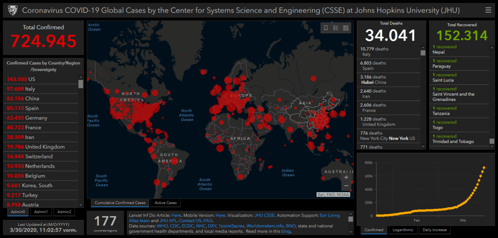 - Innerhalb von vier Tagen hat sich die Zahl der weltweit gemeldeten Infektionen von ca. 470.000 auf 781.000 erhöht, die Zahl der Todesfälle stieg von ca. 24.000 auf ca. 38.000 an, am 30. März wurde ein neuer Tages-Höchststand von 3.703 erreicht, das sind ca. 500 Todefälle mehr, als China, das Land der „ersten Phase“, insgesamt zu verzeichnen hat. Die Zahl der erkannten Neuerkrankungen stabilisierten sich in den letzten Tagen bei ca. 60.000 – der prozentuale Zuwachs ist also deutlich rückläufig.