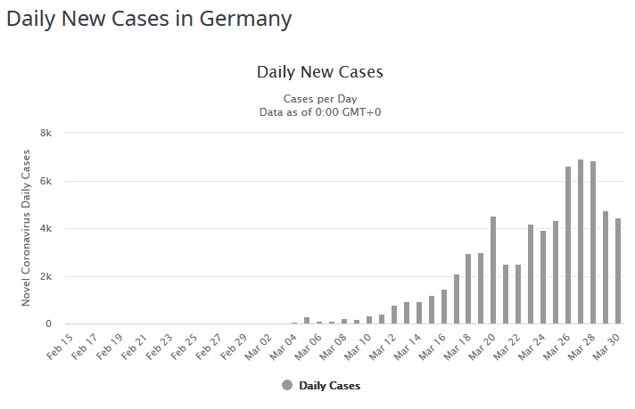 Nachtrag: Die neuen Fälle in Deutschland werden immer noch nach oben korrigiert und liegen aktuell bei 6.303, das ist der zweithöchste Wert weltweit hinter den USA und vor Spanien. Die Todeszahl steigt auf 158, vier mehr als der bisherige Höchststand gestern.