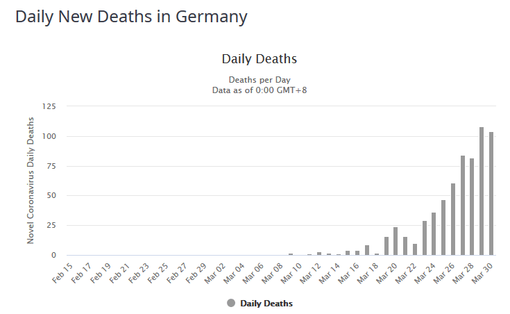 - Nun steigt nun auch die Zahl der Todesfälle in Deutschland auf etwa 100 pro Tag, mit einem leichten Rückgang gestern, liegt allerdings noch weit hinter der anderer europäischer Länder ähnlicher Größenordnung zurück: