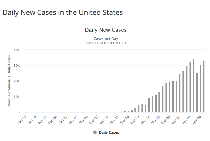 - In Relation zur Bevölkerung sind die Zahlen immer noch niedriger als in den am stärksten betroffenen europäischen Ländern Italien und Spanien, aber die Zunahme ist in den letzten Tagen sehr hoch gewesen – nachdem es am 30.03. nach einer Beruhigung, nach einem „Flatten the Curve“ aussah, das sich auch in anderen Ländern zeigte. Die rechten Balken, die den 31.03. und den 01.04. zeigen, machen deutlich, dass eine neue Welle eingesetzt hat: