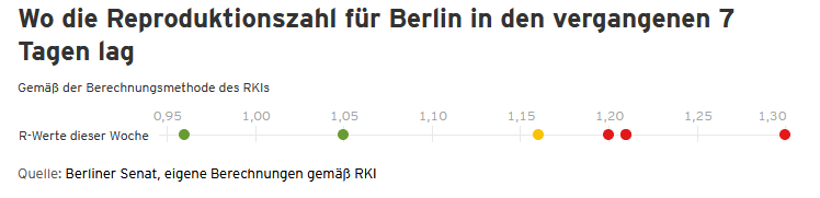 Der RBB kritisiert bezüglich der R-Zahl vor allem die Informationspolitik des Senats und was wir sehen, ist, dass nach der RBB-Berechnung die R-Zahl in den letzten Tagen nicht nur im gelben, sondern sogar im roten Bereich lag, auf bis zu 1,42 anstieg (zuletzt 1,37). Das wäre ein deutliches Zeichen dafür, dass in Berlin nicht nur „geredet“ werden muss (ab 1,1), sondern sogar gehandelt (ab 1,2) werden müsste.