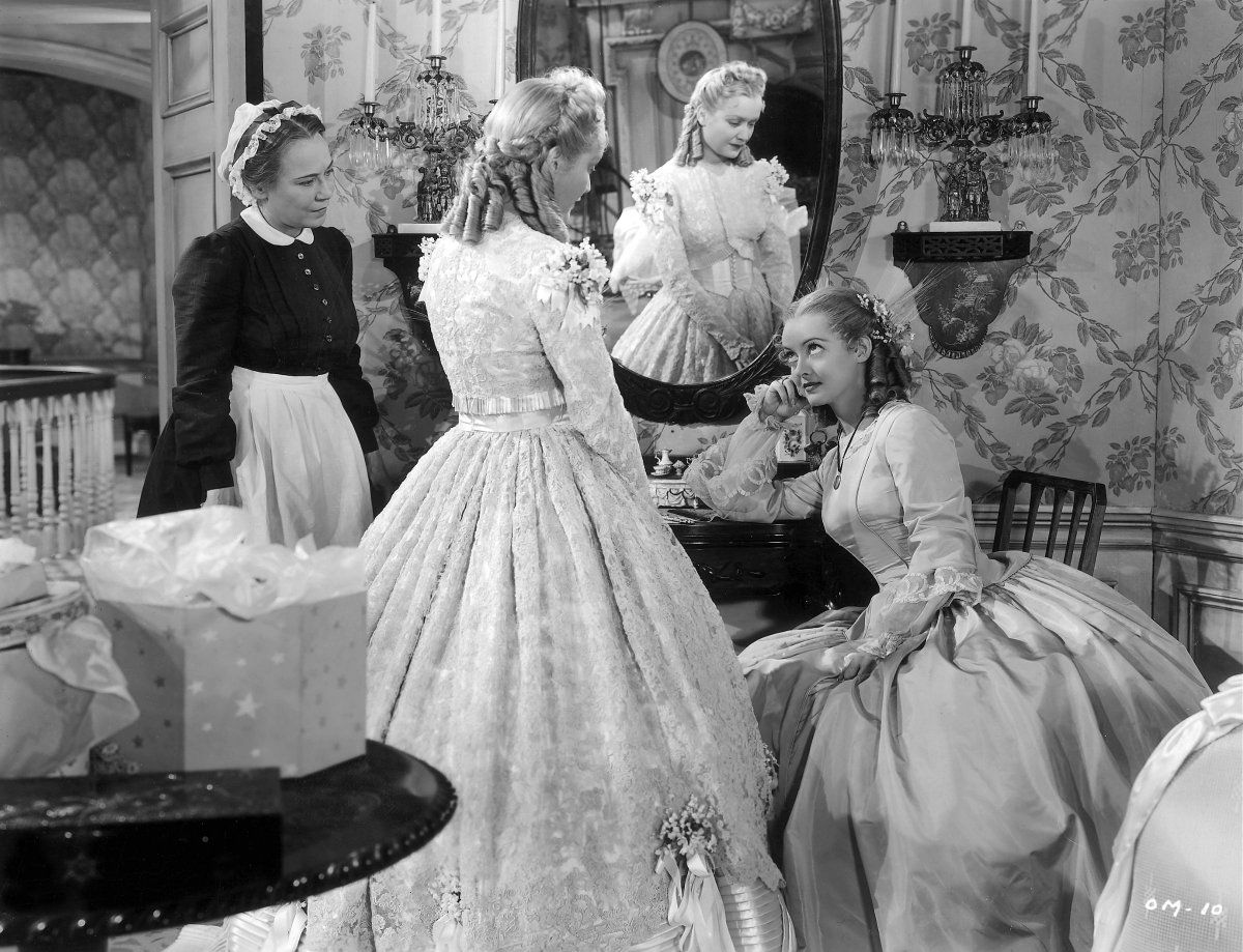 Gerade die Figur Charlotte aber ist es, die in recht großen Sprüngen entwickelt wird – es gibt keine Zwischenschritte auf dem Weg zur alten Jungfer – offensichtlich trog uns auch die Erinnerung an frühere Aufführungen des Films, in dem die Hochzeit der Tochter am Anfang stand, hässliche Worte der „alten Tante“ gegenüber – und diese sich dann erinnert an ihre eigene Jugendzeit. Rahmen, Rückblende. Der Film ist aber ganz und gar chronologisch angelegt und vier Hochzeiten und ein Todesfall sind die Ankerpunkte der Story. Zum einen die Hochzeit der Cousine Delia, die ihren Geliebten sitzen lässt, der sich in der Welt versucht, sich aber auch offenbar zwei Jahre nicht gemeldet hat, zugunsten eines High-Society-Abkömmlings, der ihr Sicherheit und Wohlstand bietet. Daraufhin angelt sich Charlotte den Typ, der am Tag der Hochzeit vorbeikommt, Delia zur Rede stellt und dann in den 1861er Bürgerkrieg zieht, der im US-Film kurz vor dem Zweiten Weltkrieg eine überragende Rolle einnimmt. Sie bekommt ein Kind von ihm, doch er fällt und sie steht allein da. Sie gründet ein Waisenhaus, in dem sie auch ihre eigene Tochter aufzieht. Sie hätte die Möglichkeit, den Bruder ihres Schwagers zu heiraten, doch ihre Cousine hintertreibt dies. Charlotte steht allein, vermutlich geht ihr auch das Geld für das kleine Asyl aus, sie zieht zu ihrer Schwester und gibt sich als Tante ihrer eigenen Tochter aus. Am Ende heiraten kurz hintereinander Delias Tochter und Charlottes Tochter – Letztere wurde von Delia adoptiert, um die gewünschte gesellschaftliche Position zu erlangen und erfährt selbst in der rührenden Schlussszene nicht, wer ihre wirkliche Mutter ist.