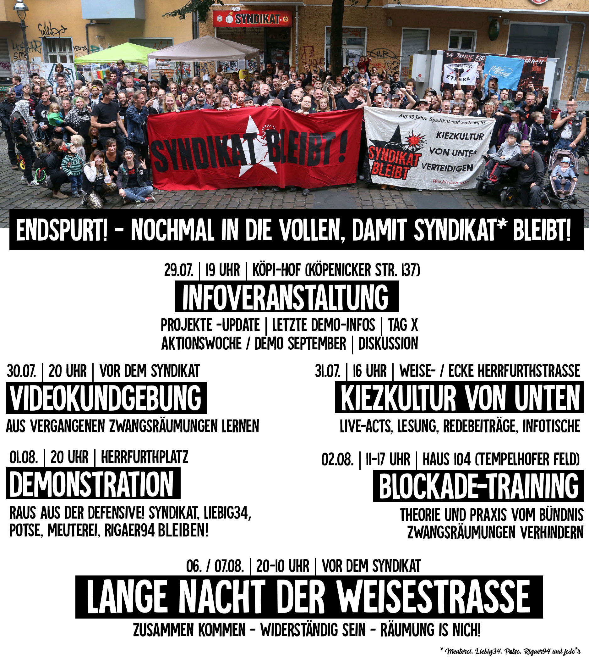 Fast jeden Tag gibt es bis zum 7. August 2020 eine Möglichkeit, sich solidarisch mit dem Syndikat zu zeigen und am 7. August die geplante Räumung zu verhindern: