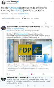 Auch die Grünen geben auf eine ziemlich hintergründige Weise zu verstehen, dass ihnen nicht so richtig viel an dem Erhalt von wichtigen Kiez-Institutionen wie dem Syndikat liegt. Wir sehen in einem Tweet vom 17. August, wie sich die Pressesprecherin der Grünen im Berliner Abgeordnetenhaus Sorgen um das politische Schicksal der FDP-Generalsekretärin Linda Teuteberg macht.