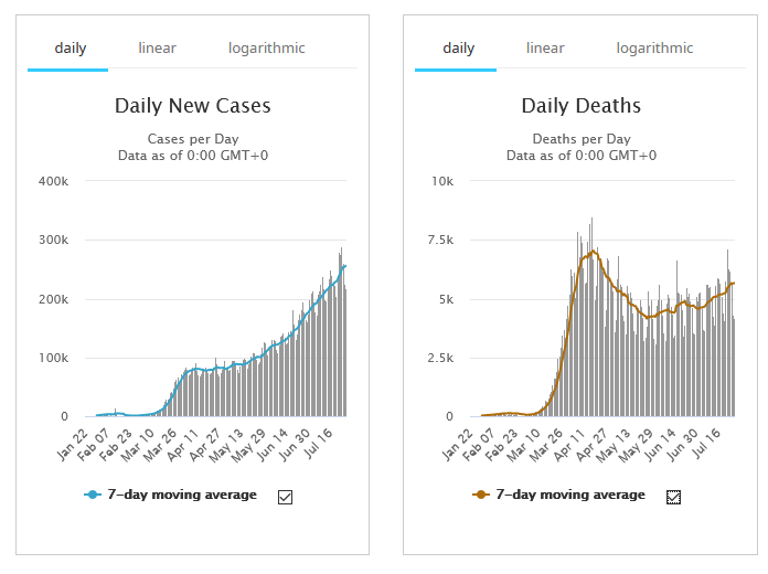 Langsam, aber mit sichtbarer Dynamik hat sich Indien auf Platz 3 vorgeschoben. Wir haben bereits mehrfach geschrieben, dass wir uns über die bisher niedrigen Fallzahlen in diesem enorm dicht besiedelten Subkontinent wundern – und sie liegen immer noch hinter denen der USA und Brasiliens zurück.