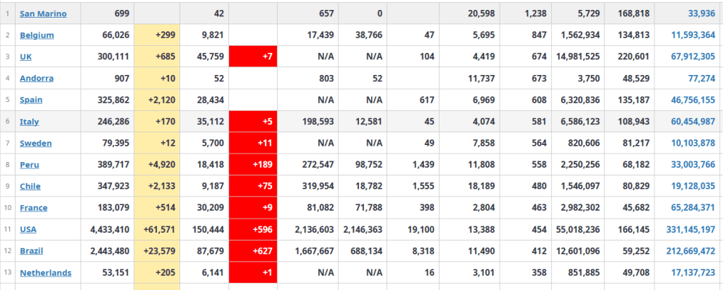 Am späten gestrigen Abend ging es um Corona. Was sonst? Zumindest überwiegend. Wir wollen nicht so tun, als wenn wir heroisch nach Themen-Alternativen suchen würden. Dabei kam auch zur Sprache, dass einige Länder, die ein besonders gutes Gesundheitssystem haben, erstaunlich hohe Fallzahlen und auch teilweise hohe Todesfallzahlen aufweisen.