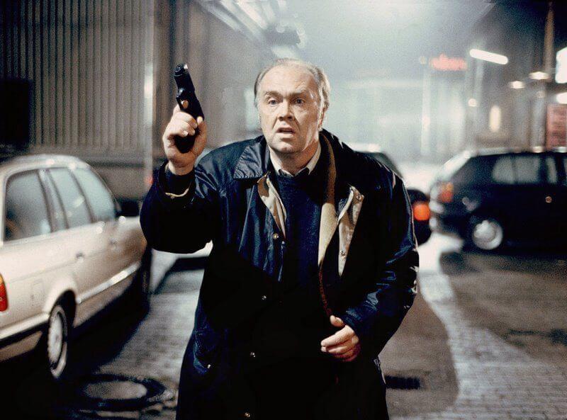 Dafür rettet die beherzte lederne Dame aus dem Revier den Kommissar vor einem veritablen „KiA“, also davor, im Dienst erschossen zu werden. Selbstverständlich trägt sie im Dienst eher ihre teuren, aber konservativen Klamotten im Zeltstil der 1990er – okay, Mitte der 1990er wurde es langsam wieder besser mit dem Geschmack, nachdem der Wendeschock verdaut und ein möglicher Einfluss des Ostens auf den Westen konsequent abgewehrt worden war. Aber die Typen!