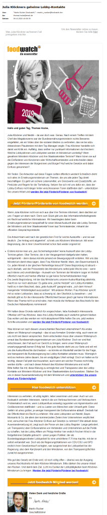 Da wir den Newsletter als Foto verbreiten, versteht es sich von selbst, dass wir den wichtigen Link, der zur Möglichkeit führt, „Foodwatch“ zu unterstützen, erst einmal sichtbar machen, mit dem Sie die wichtige zivilgesellschaftliche Arbeit der Organisation würdigen können, im Anschluss kommentieren wir kurz den Fall Klöckner.