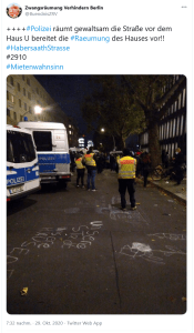 Die Lage ist momentan friedlich, ausgelassen und hoffentlich bleibt es so. Der Strom wurde zwischenzeitlich abgestellt, (…) Eigentümer, Hausverwaltung und Rechtsanwaltskanzlei sind vor Ort, (Vertreter der Eigentümer) ist mit der Polizei-Einsatzleitung momentan im Gespräch.