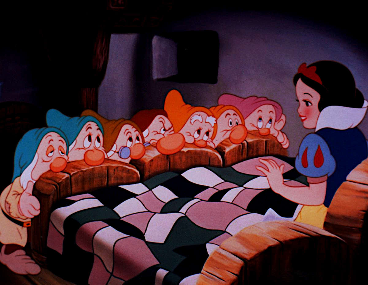 Natürlich darf man Kinder nicht permanent in Angst halten, und das tut auch „Schneewittchen“ nicht. Die niedlichen, aber durchaus im Stil der Zeit noch nicht allzu zuckersüß gezeichneten Zwerge sind grandios und sind im Vergleich mit der eher stereotypen Figur der Prinzessin höchst individuell und famose Typen, die ein weites Charakterspektrum abdecken, ohne dass es echte Helden, Angeber oder böse Figuren unter ihnen gäbe. Wenn sie aus der Diamantmine kommen und „Hi ho, hi ho, wir sind vergnügt und froh“ singen, und das sowohl vor als auch nach der Arbeit, ist man mitten im Film angekommen. Die Aufmerksamkeit, die Disney ihnen widmet, war die richtige Idee, um ein Volksmärchen, in dem mehr die Prinzessin im Vordergrund steht, auf Spielfilmlänge zu strecken und komische Situationen zu schaffen, die es im Vorbildtext nicht gibt.