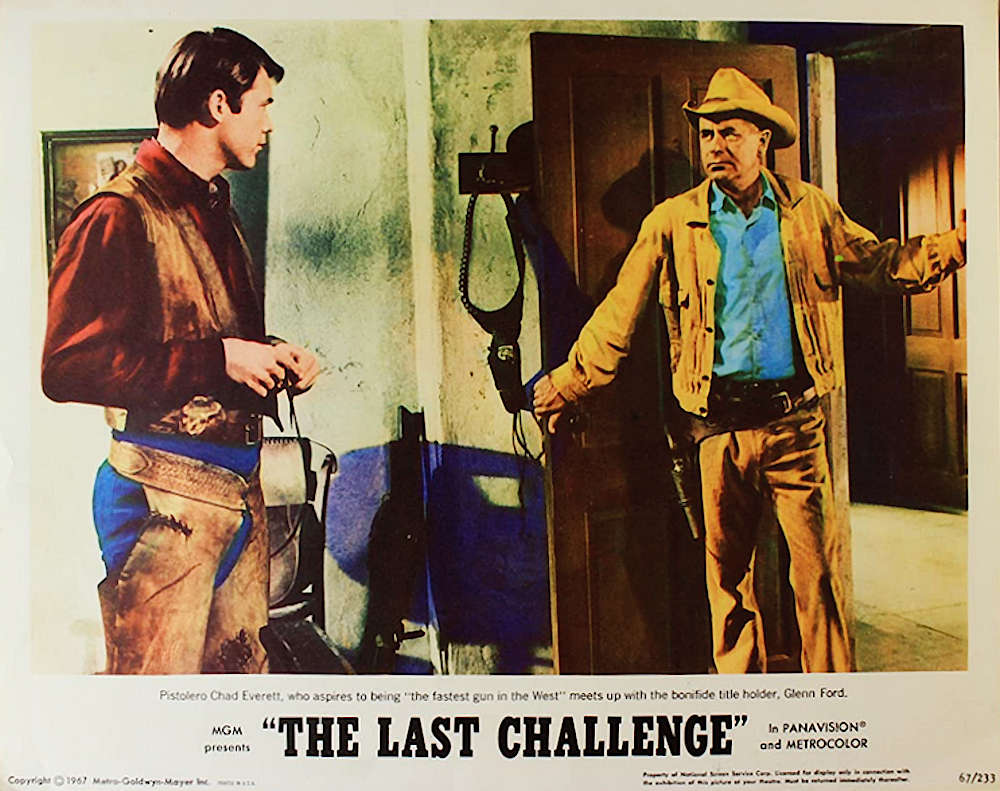 Mehr als zehn Jahre vor „The Last Challenge“ war Glenn Ford in einer ganz ähnlichen Rolle in „The Fastest Gun Alive“ zu sehen, einem Schwarzweißdrama, in dem der Konflikt des friedliebenden Mannes, der seine Vergangenheit als Revolverheld hinter sich lassen möchte, eindringlich dargestellt wird. Er ist in der Stadt nur ein Krämer, ein Ladenbesitzer, und die waren seinerzeit, wenn man diesem und anderen Filmen glauben darf, in der sozialen Hierarchie nicht gerade oben – unter anderem wohl deswegen, weil sie nichts oder nicht viel von dem legendären, weiten Land besaßen, wegen dem die Menschen aus dem alten Europa ausgewandert und unter großen Strapazen gen Westen gezogen waren, und weil sie eher friedliebende als kämpferische Naturen waren.