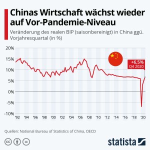 Wir werden es auch 2021 sehen: China wird stärker wachsen als andere Volkswirtschaften, obwohl diese ja erst einmal den Einbruch von 2020 wieder aufholen müssen, den China gar nicht hatte. Denn auch in China wird es zu einem Nachholeffekt kommen, wie diese Grafik verdeutlicht: BIP in China – Wirtschaftswachstum bis 2025 | Statista. Sie enthält desweiteren eine Prognose, die bis zum Jahr 2025 reicht.