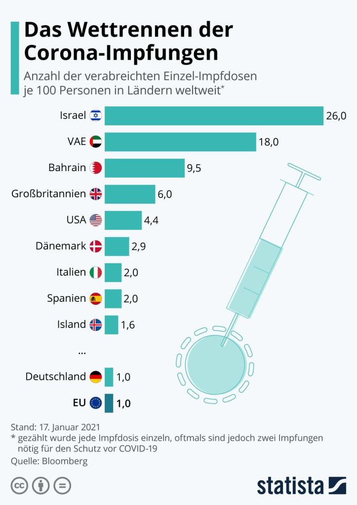 In Deutschland ist die Quote seitdem auf 1,6 Prozent der Bevölkerung angestiegen, aber in Israel auf unfassbare 36 Prozent. Das heißt, während bei uns 0,6 Prozent der Menschen geimpft wurden, hat man es dort geschafft, in derselben Zeit ein Zehntel der Bevölkerung zu schützen bzw. bei weiteren 10 Prozent der Bevölkerung mindestens eine Impfdose zu setzen.