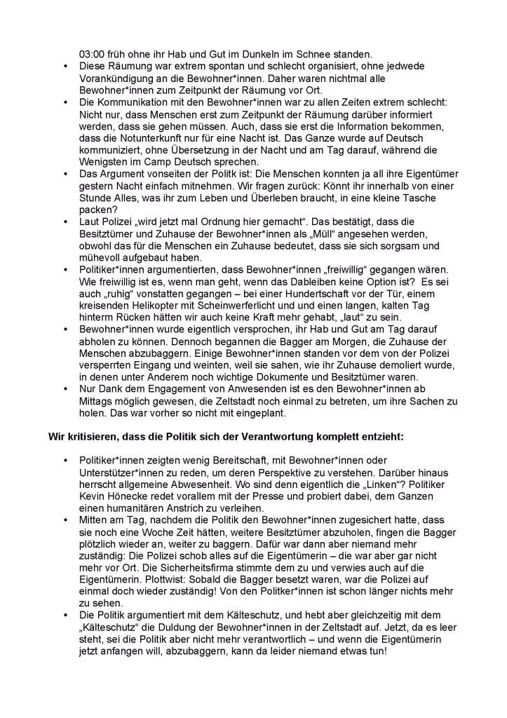 Kluge Politiker*innen haben das mittlerweile anerkannt. Ohne den Druck aus der Zivilgesellschaft gäbe es z. B. keinen Mietendeckel, sondern noch mehr Obdachlose. Außerdem war es wieder einmal eine typische, rigide Polizeiaktion, die das Gepräge der „Hilfe“ bestimmt hat und von diesen Machtdemonstrationen hat die Zivilgesellschaft hier wirklich die Nase voll. Wir erinnern, falls die Politik es schon vergessen hat, an die Räumungen der Liebig 34 oder des Syndikats in den letzten Monaten.