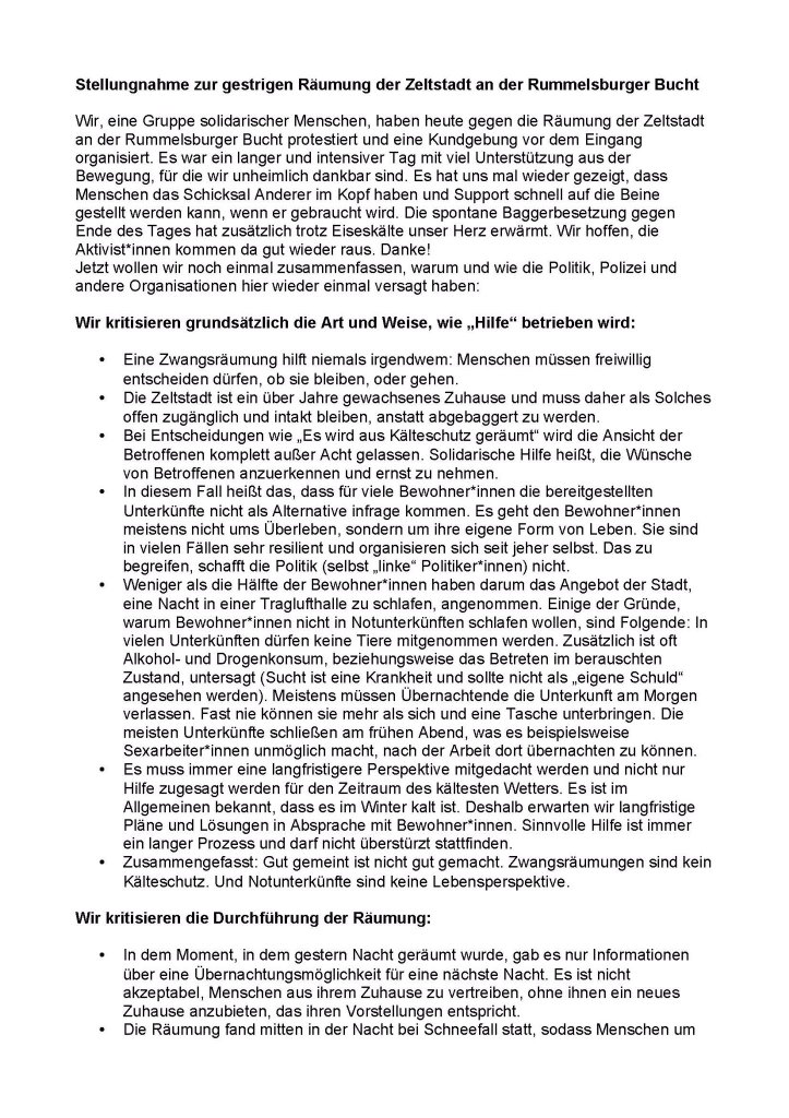 „Anlässlich der Demo 10.2/13h/Rotes Rathaus wg. aufgelöstem Camp Rummelsburger Bucht werden in enger Absprache mit den Betroffenen dringend benötigt: – Schlafsäcke – Decken – Pullover – Jacken – Mäntel – (Jogging)hosen – DICKE Socken – saubere / neue Unterwäsche – med. Masken – Hygieneartikel – verpackte Lebensmittel, die keiner Zubereitung bedürfen/Nervennahrung.„