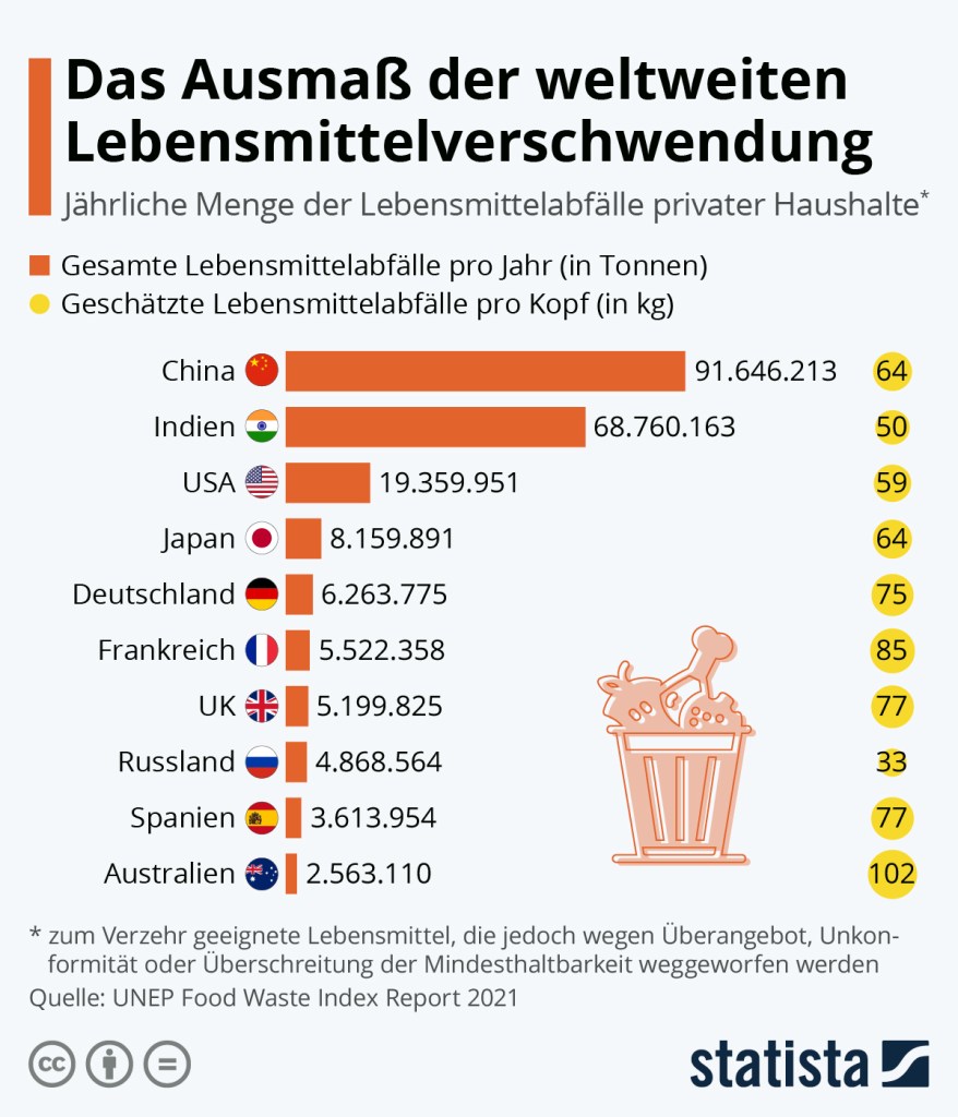 Überangebot in den Regalen, das verstehe ich noch. Es wird eben zu viel produziert. Und Containern ist verboten, auch dazu komme ich noch. Okay, einiges wird an Tafeln und andere Einrichtungen abgegeben. Trotzdem wird auch im Handel und bis zum Handel viel zu viel entsorgt. Aber Überangebot zuhause? Augen größer als Magen, wieder mal? Das muss man doch irgendwann mal in den Griff kriegen, oder? Auch sehr gut: „Unkonformität“. Wieder mal was gekauft, was dann doch nicht optimal in der jeweiligen Situation schmeckt? Klar, es kann viele Jahrzehnte dauern, bis man seinem eigenen Gaumen und seinen eigenen Launen auf die Spur kommt. Manche schaffen es nie, die Hälfte fliegt in den Müll. Abgelaufenes MHD verstehe ich noch am besten, manche Menschen sind in der Hinsicht sehr pingelig, ohne zu kontrollieren, ob die betreffende Speise wirklich nicht mehr genießbar ist, denn ein MHD ist kein MHD. Mindestens haltbar bis meint eben etwas anderes als maximal haltbar. Selbst das maximale Haltbarkeitsdatum ist manchmal noch recht eng gefasst, damit auch ja nichts passieren kann. Prinzipiell ist das auch richtig, aber manchen Lebensmitteln sieht und riecht man an, ob sie noch gut sind. Es ist auch keine Entschuldigung, dass es Länder gibt, in denen noch mehr verschwendet wird, dafür kann es verschiedene Ursachen geben. Und wir orientieren uns in anderen Dingen, wie z. B. bei der Energiewende, ja auch nicht anderen, vor allem nicht an denen, die es besser machen sondern wählen immer diejenigen, die das Ganze innerhalb von 20 Jahren schon mindestens zweimal versemmelt haben.