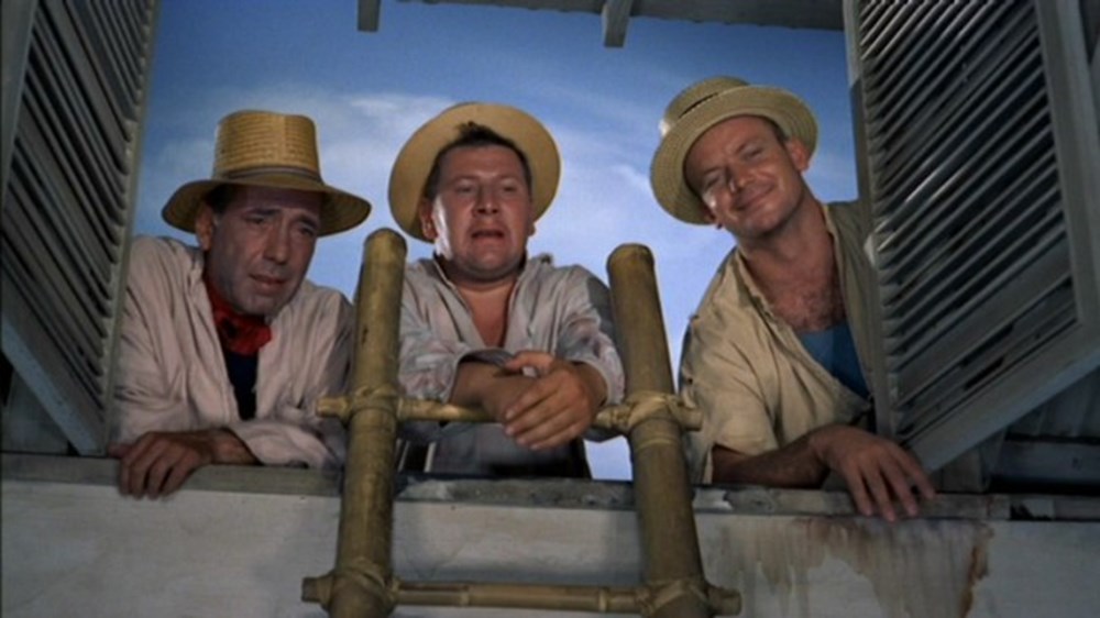 Peter Ustinovs Schauspielkunst haben wir bereits in mehreren Beiträgen zum Thema Film gewürdigt (2). „Wir sind keine Engel“ haben wir uns speziell unter dem Gesichtspunkt des Vergleichs zwischen ihm und Bogart angeschaut. Keine Frage, dass die beiden sehr unterschiedliche Typen darstellen, dies halten wir aber gerade für reizvoll, entgegen der in der erwähnten Kritik geäußerten Ansicht (1), und wir meinen auch, dass die beiden sich nicht viel schenken. Ustinov hat die besseren Dialogsätze und sein Minenspiel ist einmal mehr großartig – auch wenn die Rolle solche Exzesse wie in „Quo Vadis“ nicht zulässt. Aber sein Julius ist durchaus ein Grenzgänger, der hier von Frauen schwärmt, aber seine Frau umgebracht hat und deshalb auf die Teufelsinsel musste. Vermutlich war es eine Affekttat, sonst wäre er nach damaligem Recht eher unter die Guillotine geraten. Dass der Mann auch ganz anders kann, eine ganz subtile, leicht schräge Form von Gefährlichkeit ausstrahlt, das ist sehr schön gespielt. Es hätte einen Tick mehr sein dürfen, wie auch bei Bogart, der ausgerechnet dann um brutalsten wirkt, wenn er Kunden von Ducotel etwas andreht, was sie gar nicht wollen, um dem Geschäft zu mehr Einnahmen zu verhelfen.