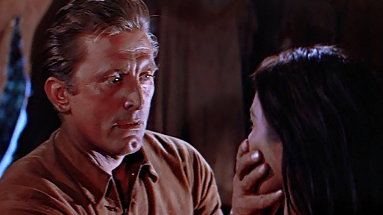 Auf so etwas stehen die Frauen in „The Indian Fighter“. Die weiße Siedlerin aus dem Wagentreck ist hinter ihm her, aber er will nicht. Die junge Native American (Elsa Martinelli [„Hatari“] in ihrer ersten Hollywoodrolle) will erst nicht, er weiß aber, was sie wirklich will. Im Fluss zieht er sie einfach an den Haaren und die beiden liegen umschlungen im rauschenden Bach. Eine für damalige Verhältnisse offensive Szene, das wilde Wasser symbolisiert die Gefühle. Dass seine ersten Annäherungsversuche nicht als versuche Vergewaltigung interpretiert werden, dafür sorgt ein einfacher Trick – er weiß ja, dass sie ihn will, nur sie weiß es noch nicht oder gibt es nicht zu und ziert sich. Schwamm drüber, irgendwie hat es Charme, wie die beiden einander näher kommen. Diesen Part hat Douglas sich gegönnt, denn in anderen Filmen der Zeit steht er meist hinter einem anderen zurück, wenn’s um die Eroberung von Damenherzen geht – hinter Burt Lancaster oder Rock Hudson und wie die anderen, charmanter und weniger maniacmäßig wirkenden Stars hießen. Oder er zieht weiter, wie im oben per Fußnote erwähnten „Mit stahlharter Faust“, der ebenfalls 1955 entstand.
