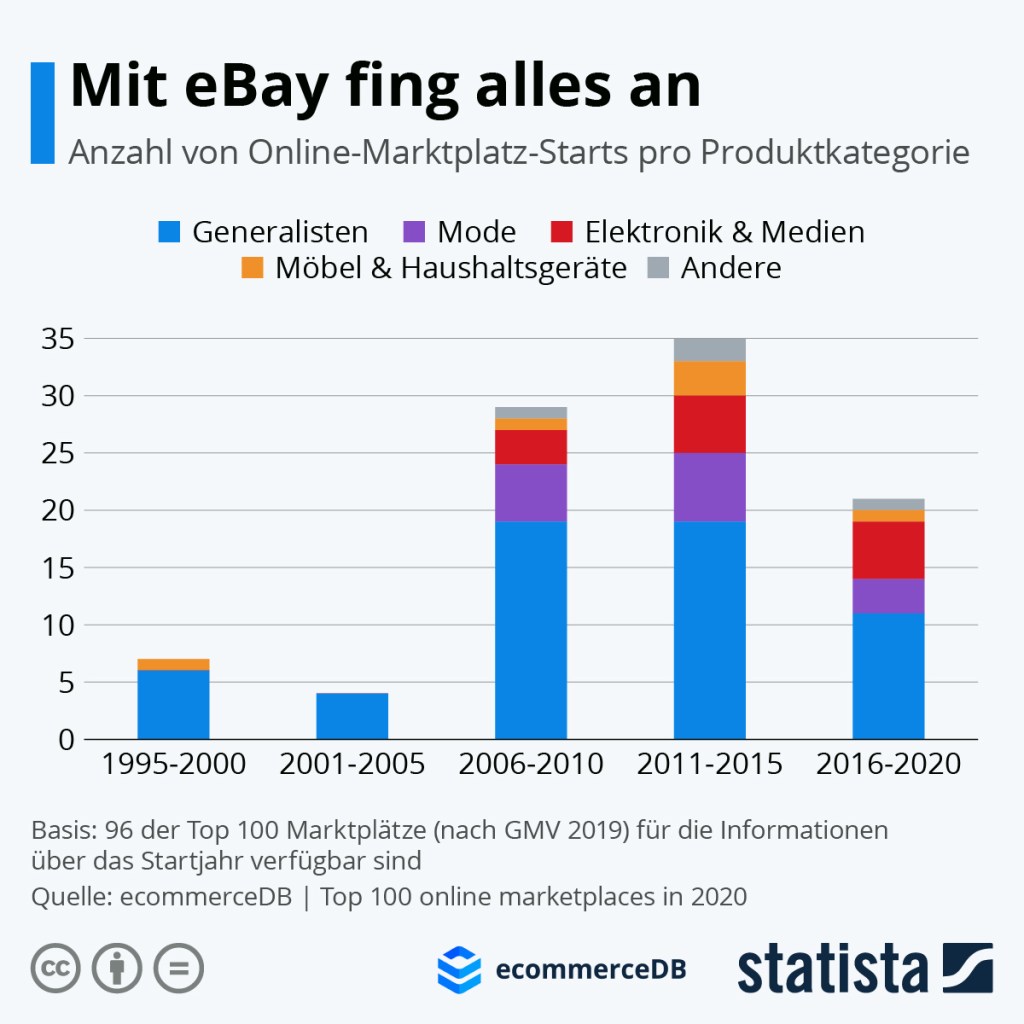 Seit 1995 gibt es eBay. Das Unternehmen ist gewissermaßen die Mutter aller Online-Marktplätze. Und es zählt auch ein Vierteljahrhundert später noch zu den fünf weltweit führenden elektronischen Marktplätzen zum Verkauf von Produkten, wie die Analyst_innen der ecommerceDB in ihrer Studie die „Top 100 online marketplaces in 2020“ zeigen. Der zufolge sind die führenden Marktplätze der Welt zu fast 60 Prozent Generalisten. Lediglich in den Segmenten Mode sowie Elektronik & Medien hat sich eine nennenswerte Zahl erfolgreicher Plattformen etabliert (…). Richtig Fahrt aufgenommen hat das Geschäftsmodell erst ein Jahrzehnt nach der eBay-Gründung: 85 Prozent der Top 100-Marktplätze sind ab 2006 gestartet. (Hier zur Statista-Grafik, zum vorstehenden Begleittext und zu weiteren Infos).