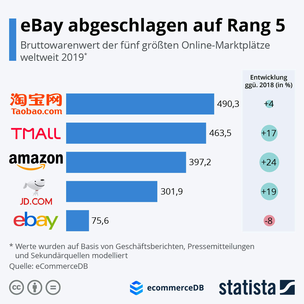 eBay gibt es bereits seit 1995. Das US-Unternehmen dürfte bis in die 10er-Jahre hinein der größte Online-Marktplatz der Welt gewesen sein. Mittlerweile reicht es aber nur noch für den fünften Rang, wie eine eCommerceDB-Analyse der Top 100 Marktplätze zeigt. Mehr noch: Der Bruttowarenwert (GMV) war 2019 bei eBay im Gegensatz zu allen anderen der Top 5-Plattformen rückläufig. Klarer Gewinner ist Alibaba, dass mit seinen Plattformen Taobao und Tmall 2019 auf fast eine Billion US-Dollar GMV kommt. Amazons Marktplatz schafft es mit fast 400 Milliarden US-Dollar auf den dritten Platz vor JD.com (301,9 Milliarden US-Dollar). (Hier zur Statista-Grafik, zum Begleittext und zu weiteren Infos).