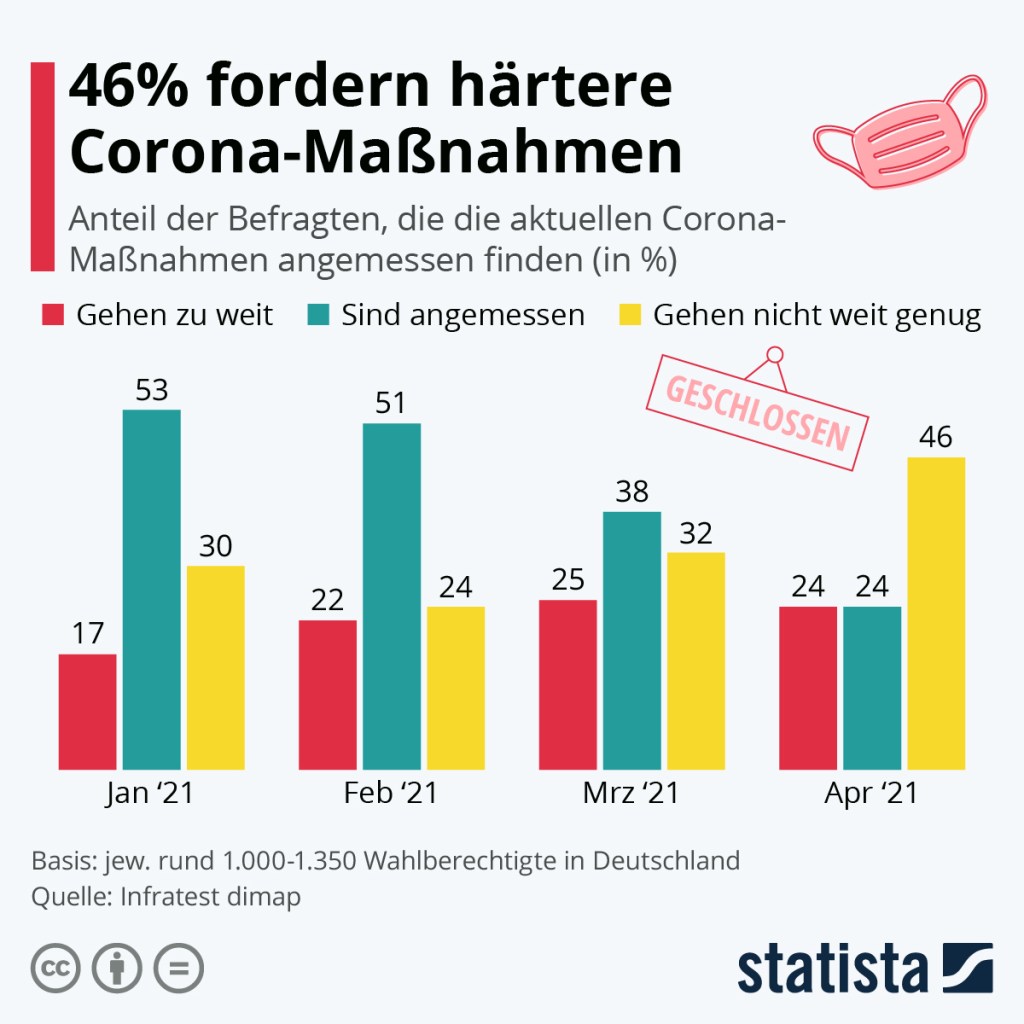 Bis vor kurzem hielt dem ARD-DeutschlandTrend zufolge mehr als die Hälfte der Bevölkerung die Corona-Maßnahmen für angemessen. Aber mittlerweile macht sich Unzufriedenheit breit, wie die letzte Ausgabe des DeutschlandTRENDs zeigt. Nur noch 24 Prozent sind mit den aktuellen Regelungen zur Pandemiebekämpfung einverstanden. Dagegen gehen die Einschränkungen fast jedem zweiten Befragten – und damit mehr als in allen Umfragen zuvor – nicht weit genug. Ihnen gegenüber stehen 24 Prozent, denen die Maßnahmen zu weit gehen. (Zur Grafik und zum Begleittext von Statista)