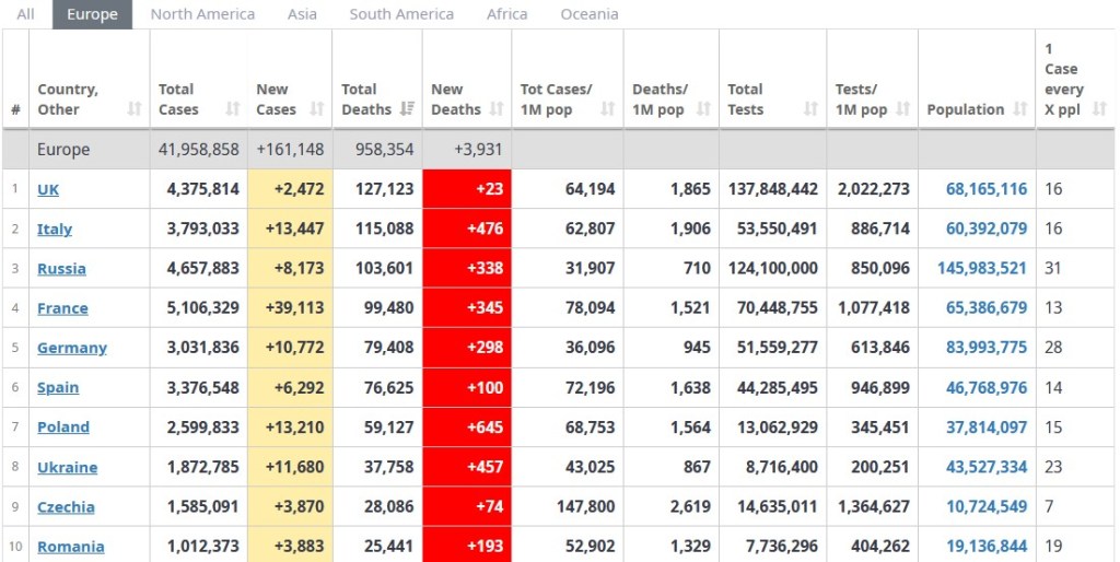 Auch Premierminister Boris Johnson hat verlauten lassen, dass er sich am 13.04. ein Bier an einer öffentlichen Zapfstelle genehmigen werde. Derzeit wird er vielfach als Corona-Held gefeiert. Aber die Menschen vergessen schnell, deshalb helfen wir mit ein paar Zahlen nach. Mag schon sein, dass sie in Großbritannien beim Impfen effizienter sind, sogar ganz sicher, und vielleicht cleverer gedealt haben, mit den Impfstoffherstellern, obwohl die EU das Gegenteil behauptet. Man sieht ja nicht alles, vor allem nicht, was nicht öffentlich schriftlich festgehalten wurde. Aber das Vereinigte Königreich sieht überhaupt nicht gut aus, Corona betreffend. Dass wir in Deutschland vermutlich höhere Infektionszahlen hätten, wenn mehr getestet würde, haben wir mehrfach erwähnt (aus gegebenem Anlass: Wir haben nie geschrieben „im Maßstab 1:1“). Aber die Todesfallzahlen in Großbritannien sind immer noch die höchsten in Europa: