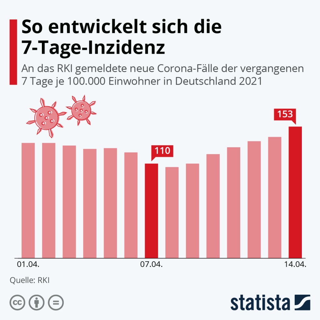 Die Zahl der Corona-Fälle je 100.000 Einwohner in den letzten sieben Tagen ist zuletzt wieder gestiegen und liegt aktuell bei 153. Das zeigt die Statista-Grafik auf Basis von Daten des Robert Koch-Instituts. In Thüringen stieg die Zahl der Neuinfektionen in den letzten sieben Tagen dabei am schnellsten. Um die Sieben-Tage-Inzidenz schnell wieder zu senken, hat das Bundeskabinett am gestrigen Dienstag eine Ergänzung des Infektionsschutzgesetzes beschlossen. Dieses neue Infektionsschutzgesetz sieht insbesondere für Kreise oberhalb der Inzidenz von 100 ein Reihe von verschärften Maßnahmen vor, darunter Kontaktbeschränkungen, Schließungen von Geschäften, Kultur- und Sporteinrichtungen und nächtliche Ausgangssperren. (…) (Zur Grafik und zum Begleittext von Statista.)