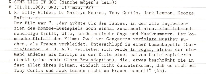 Zum Inhalt des Films und zur Entschuldigung für die Rollenfigur von Marilyn Monroe müssen wir der obigen Rezension beifügen: Der Witz des Films rührt daher, dass nicht nur „Sugar“, sondern auch alle anderen von der Damenkapelle und auch die Gangster, auf die man im Hotel von Miami Beach trifft, nicht merken, um wen es sich bei den beiden weltberühmt gewordenen „Damen“ Daphne und Josephine handelt. Sofern wir nicht erleben, dass dieser Film unter die Räder einer rüden Form von politischen Korrektheit kommt, wird er ewig bleiben, so viel steht fest. Alle Beteiligten waren auf der Höhe ihres Könnens, und das sagt bei Spitzenkräften wie Billy Wilder, Marilyn Monroe, Jack Lemmon und Tony Curtis schon alles. Mein persönlicher Favorit von Wilder ist zwar dennoch „Das Appartement“, aber unter der klaren Prämisse, dass dies eine Geschmacksfrage ist, nicht eine Entscheidung nach Qualität. Die 9 Punkte, die wir im Jahr 1989 für „Manche mögen’s heiß“ vergeben haben, würden auch heute wieder zustande kommen. Vielleicht noch einer oder zwei extra für die herausragende Stellung dieses Films in seinem Genre. Beide zählen zu unseren Lieblingsfilmen, während weitere Wilder-Klassiker wie „Frau ohne Gewissen“ oder „Boulevard der Dämmerung“, die wir hier besprochen haben, ähnlich hoch anzusiedeln sind, aber diesen persönlichen Status nicht erreicht haben.