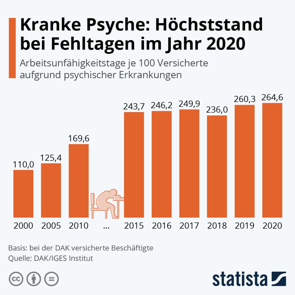 • Infografik: Kranke Psyche: Höchststand bei Fehltagen im Jahr 2020 | Statista