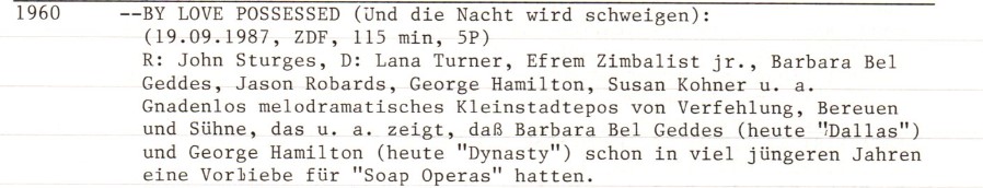 Ich freue mich immer, wenn die Einschätzungen meiner frühen Jahre sich heute in der Ansicht der IMDb-Nutzer*innen spiegeln. Das tun sie in diesem Fall, der Film kommt auf durchschnittlich 5,4/10 Punkte. Den äußerst beliebten Stoff „Peyton Place“ kannte ich damals noch nicht, aber kann mir in etwa vorstellen, was George Hamilton, der später in „Dynasty“ („Der Denver-Clan“) noch einmal groß herauskam, wenn auch nur für 15 Folgen, möglicherweise ein wenig selbstironisch, damit meinte. Dass John Sturges auch in diesem Genre des tränenreichen Melodrams tätig war, habe ich jetzt auch noch einmal gelernt. Kürzlich hatte ich mir „Vierzig Wagen westwärts“ von ihm angeschaut, die Rezension dazu wird demnächst auf dem Filmfest gezeigt werden. Zu Barbara Bel Geddes‘ Ehrenrettung muss man aber auch sagen, dass sie in Hitchcocks „Vertigo“ eine eher forsche und ironische Frau gespielt hat.