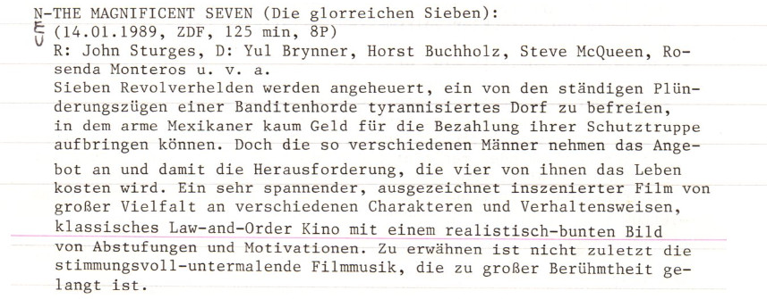 Heute käme es wohl zu einer Bewertung, die sogar etwas über der 8/10 liegt, die ich im Jahr 1989 vergeben hatte, aber es ist mit dem aktuellen 100er-Schema auch etwas leichter, exakt vor allem zwischen guten, sehr guten und herausragenden Filmen zu differenzieren. Es wird auch zu einer .1-Rezension kommen, denn eine Neusichtung aus den 2010ern liegt vor. Insgesamt habe ich „Die glorreichen Sieben“ mindestens dreimal angeschaut, das Vorbild, „Die sieben Samurai“, hingegen erst einmal.