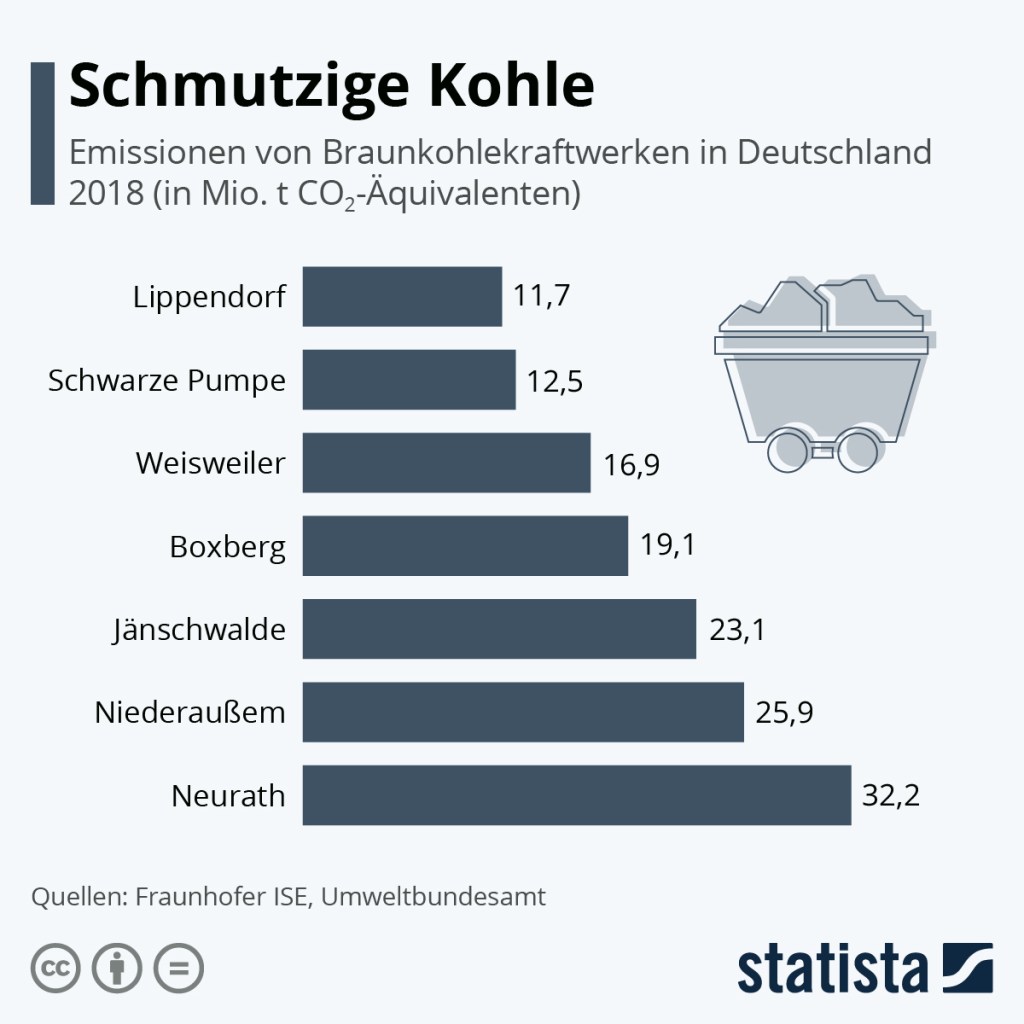 Der Energiesektor ist für den Großteil der Treibhausgasemissionen in Deutschland verantwortlich. Bei der Energiegewinnung aus Steinkohle und Braunkohle wird viel klimaschädliches CO2 freigesetzt. Wie die Statista-Grafik zeigt, ist allein das Braunkohlekraftwerk Neurath für 32,2 Millionen Tonnen CO2-Äquivalente im Jahr 2018 verantwortlich – das ist fast so viel wie der gesamte polnische Energiekonzern PGE im selben Jahr verursachte.