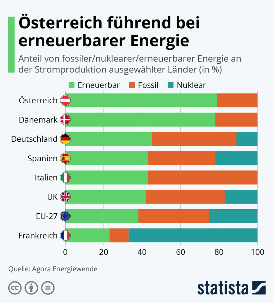 Österreich kommt auf fast 80 Prozent, Dänemark ebenfalls. Das klingt super, aber in Österreich hatte immer schon die Wasserkraft einen sehr hohen Anteil an der Energieversorgung und Österreich muss nicht, wie Deutschland, die bisherigen Kernkraftanteile ausgleichen. Dänemark wird einen großen Offshore-Windpark bzw. eine Windpark-Insel bauen, das größte Projekt dieser Art in Europa, das vermutlich auch dem Stromexport dienen wird. Wie die Kernkraft den Einsatz der Erneuerbaren bremst, sieht man am besten am Beispiel Frankreichs. Trotzdem hat Frankreich eine vergleichsweise gute CO²-Bilanz, weil es nur wenig fossile Energieträger einsetzt. „2023 soll in Flamanville der nächste Atommeiler ans Netz gehen„, heißt es im Begleittext von Statista.