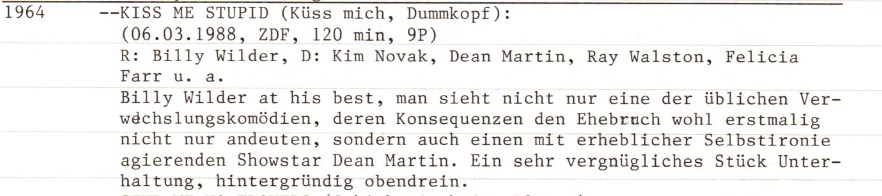 Für einen Wilder-Film sind die 7/10, die „Küss mich, Dummkopf“ aktuell von den IMDb-Nutzer*innen erhält, recht wenig, gleichwohl weisen sie darauf hin, dass der Film nicht gänzlich misslungen sein kann. Diese und selbst die nachfolgende Komödie „Der Glückspilz“ hat Wilder wieder einmal in Schwarz-Weiß gefilmt, obwohl das in den 1960ern, auch und gerade in diesem Genre, nicht mehr üblich war (nur „Irma“ und „Das verflixte siebte Jahr“ bildeten bis dahin bunte Ausnahmen in Wilders Werk).