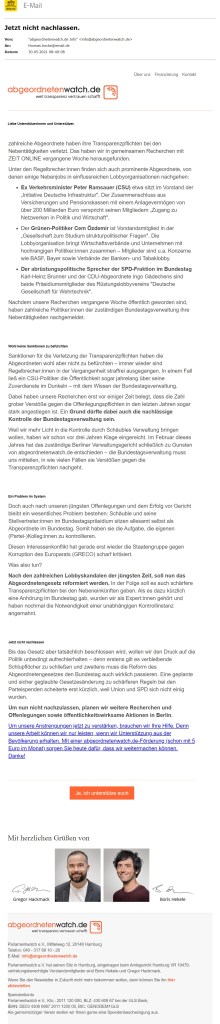Die Möglichkeit, Abgeordnetenwatch zu unterstützen, können sie in dem als Foto eingebetteten Newsletter nicht anklicken, daher hier noch einmal der Link: Spendenformular | abgeordnetenwatch.de. Dieses Mal haben wir auch den Footer komplett abgebildet, damit Sie weitere Informationen über die Organisation und deren Status erhalten. Deswegen dieses Mal auch ein Disclaimer: Wir sind nicht Mitglied der Organisation und unser Support beschränkt sich derzeit auf die Weiterverbreitung von Nachrichten von Abgeordnetenwatch.