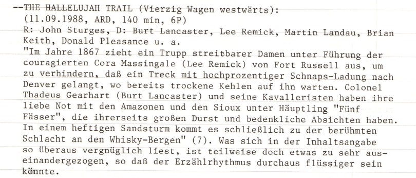 Was mich immer ein wenig berührt, ist, wenn Filme schon aus der Zeit gefallen sind, wenn sie erscheinen. „Vierzig Wagen westwärts“ ist noch von der lockeren Art der Kennedy-Jahre geprägt, erschien aber erst 1965, als der Italo-Western bereits die zwar nicht humorfreie, aber doch ganz andere Richtung des Genres für die nächsten Jahre vorgab. Die IMDb-Nutzer vergeben aktuell durchschnittlich 6,6/10 für „Vierzig Wagen westwärts“, das ist für eine so aufwendige und hochkarätig besetzte Produktion nicht gerade ein Top-Wert. Ich vermute, dass wir beim Wahlberliner anlässlich einer Neubewertung etwa bei 70/100 herauskommen werden.