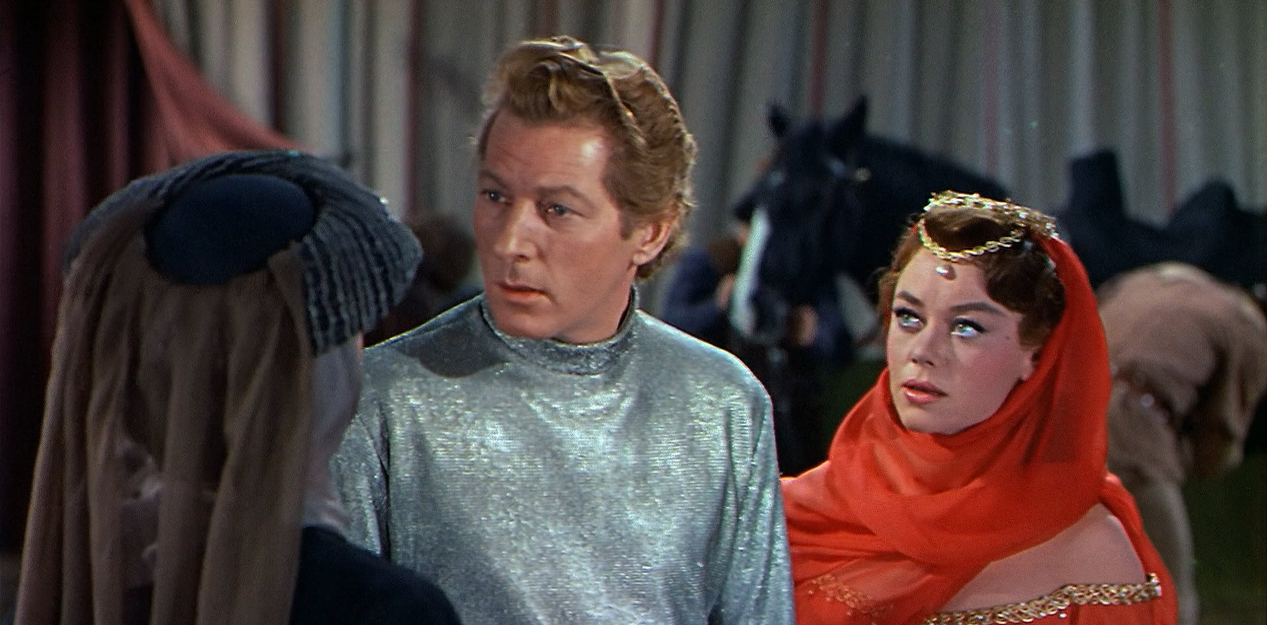 Auf die visuellen Gags trifft das nicht zu und es gibt eine Szene, die steht für mich über allen anderen. Das ist die beschleunigte Ritterwerdung des Jack Hawkins. Die Choreografie ist exzellent, besonders, als die beiden Reihen von für die Zeremonie abkommandierten Soldaten marschierend ineinander gekreuzt werden und außerdem auch noch Hawkins mittendrin herumturnt. Das hat Busby-Berkley-Qualität und auch die Beschleunigung eines normalerweise jahrelang dauernden Prüfungsverfahrens als solche ist eine der gelungensten Verballhornungen des mediävistischen Gepräges von skillful Operance, die man sich denken kann. Unterstützt durch die fantasievollen Kostüme vieler Beteiligter und wenn es sich dabei um die Hollywood-Variante dieses Gepräges handelt, die der Wirklichkeit an Eleganz um einiges überlegen gewesen sein dürfte.