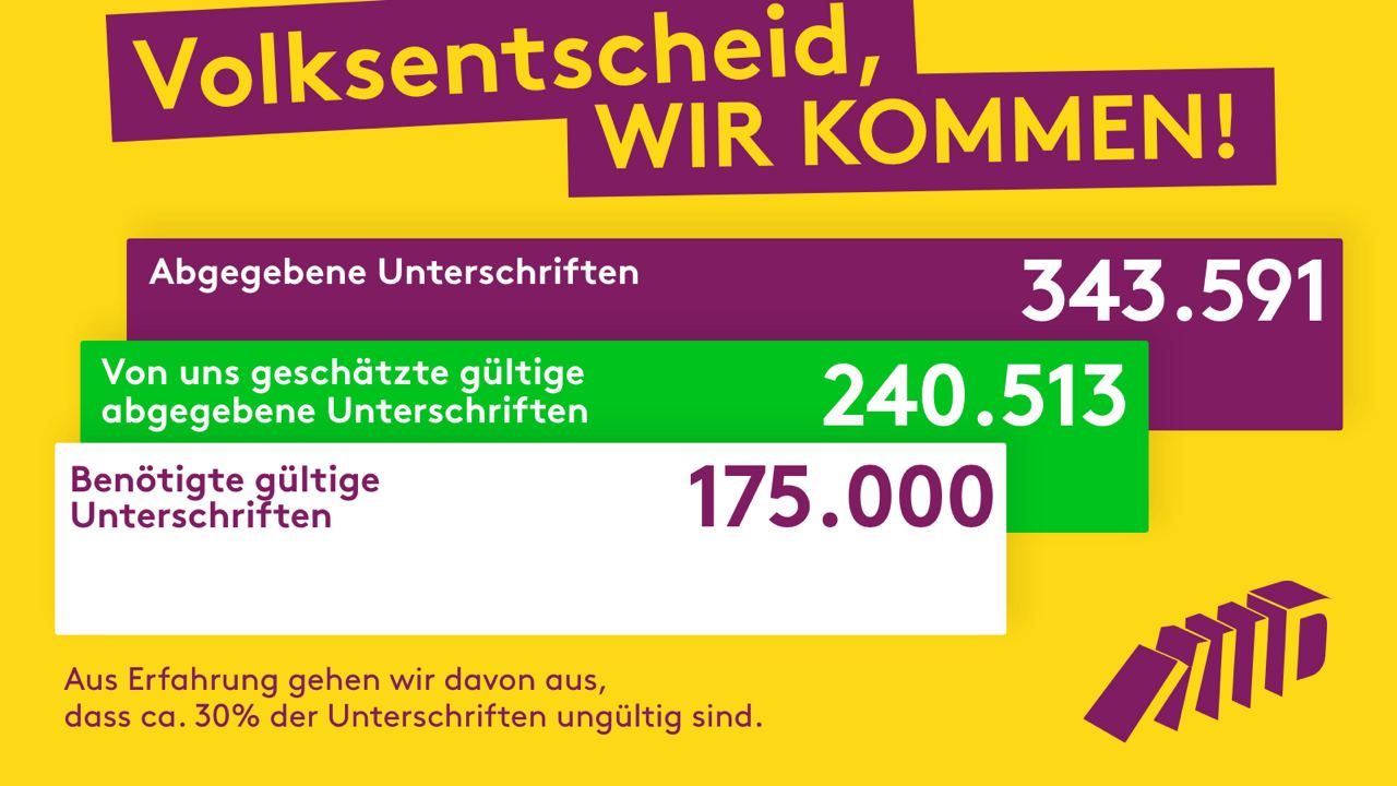 Es war spannend, weil zuletzt keine Zwischenergebnisse mehr veröffentlicht wurden, aber die Initiative rechnet mit ca. 240.000 gültigen Unterschriften insgesamt wurden über 343.000 abgegeben. Das würde der letzten mitgeteilten Quote entsprechen, die bei etwa 70 Prozent nachgeprüft gültigen und ca. 30 Prozent ungültigen Unterschriften lag. Selbst, wenn die Quote der gültigen Unterschriften während des Schlussakkords der Sammeltätigkeit noch gefallen wäre, sollte die erforderliche Mindestzahl auf jeden Fall zustande gekommen sein.