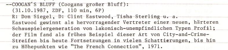 Als das „Internationale Fimverzeichnis Nr. 8“ erstellt wurde, dem die gegenwärtige Chronologie unserer veröffentlichten Rezensionen alternierend zu neueren Kritiken ab 2011 folgt, erstellt wurde, war Eastwood schon als Regisseur unterwegs, aber die vielen Oscars, die er seitdem errungen hat, lagen alle noch voraus. Erst gestern haben wir eine Rezension zu „A Perfect World“ geschrieben, die wir auf dem Filmfest zeigen werden, wenn wir in den 1990ern angekommen sind. Ohne Zweifel zählt Eastwood zu den wichtigsten Filmemachern der letzten Jahrzehnte, vielleicht zu den größten Autorenfilmern übehraupt. Das heißt nicht, dass man alle seine Filme als herausragend ansehen muss und das haben wir bei „Coogans großer Bluff auch nicht getan. 6/10 waren damals eine durchschnittliche Bewertung, als er gerade versuchte, erste Schritte heraus aus dem Szenario der Italo-Western zu machen, mit denen er gerade berühmt geworden war. Die IMDb-Nutzer:innen vergeben aktuell durchschnittlich 6,4/10 für „Coogans großer Bluff“.
