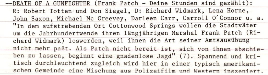 Die 1950er und 1960er waren in den USA sehr westernlastig, das ist schon klar, und wir müssen im Rahmen der Erstellung des Gesamt-Artikelverzeichnisses unbedingt die Genres listen, zu denen Filme gerechnet werden können, dann sehen wir, ob unser Eindruck stimmt, dass Western in dem, was wir bisher rezensiert haben, bezüglich der USA und der beiden Dekaden von 1950 bis 1969 dominieren. Allerdings ist das, was wir mit „Frank Patch“ vor uns haben, bereits ein Spätwestern, während wir gestern Abend in die Zeit zurückgegriffen haben, als das Genre in voller Blüte stand.