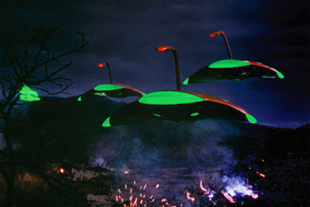 Was bleibt, ist dennoch die tricktechnische Pionierleistung und das Zeugnis aus einer Zeit, die genauso panisch war wie die heutige, das der Film ablegt. Unser Titelbild zeigt eine typische Dreier-Kampfgruppe von Marsianer-Raumschiffen auf Feindflug. Ganz links kann mean einen grünen Vernichtungsstrahl erkennen, es gibt aber noch die funkensprühende rot-rosane Variante.