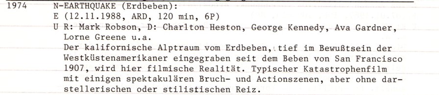 Die IMDb-Nutzer:innen von heute sind nicht mehr so hingerissen von den technischen Spezialeffekten wie dem „Sensurround“-Verfahren, das so realistisch war, dass in einigen Kinos Deckenteile einstürzten, als es getestet wurde. Vermutlich ist die Rezeption heute eher bescheiden, weil das Werk eher am Fernseher betrachtet wird, und bei allem, was das Heimkino heute bietet, ein Soundsystem, das Bauschäden verursachen kann, ist zumindest generell sicher nicht erlaubt. Was die Liebhaber wandgroßer Fernseher selbst basteln, um sich beim Anschauen von Gebäudetrümmern die Ohren zu zertrümmern, ist eine andere Sache. Die Durchschnittswertung von 5,9/10 in der IMDb entspricht beinahe exakt meiner Bewertung aus dem Jahr 1989. Eine hochkarätige Besetzung mit Altstars, wie sie hier zu sehen ist, kann sich in Filmen wie diesem immer nur begrenzt als wirksam erweisen, weil die Action und die Materialschlacht im Vordergrund steht und in sie nicht ein einzelner Actionheld so integriert ist, dass er das Szenario dominiert. Das sollte sich in den 1980ern ebenfalls ändern und ein Problem älterer Filme dieser Art ist, dass sie mit den heutigen CGI-unterstützten Werken des Action- und Abenteuerkinos bezüglich der optischen (Über-) Reizung nicht mithalten können.