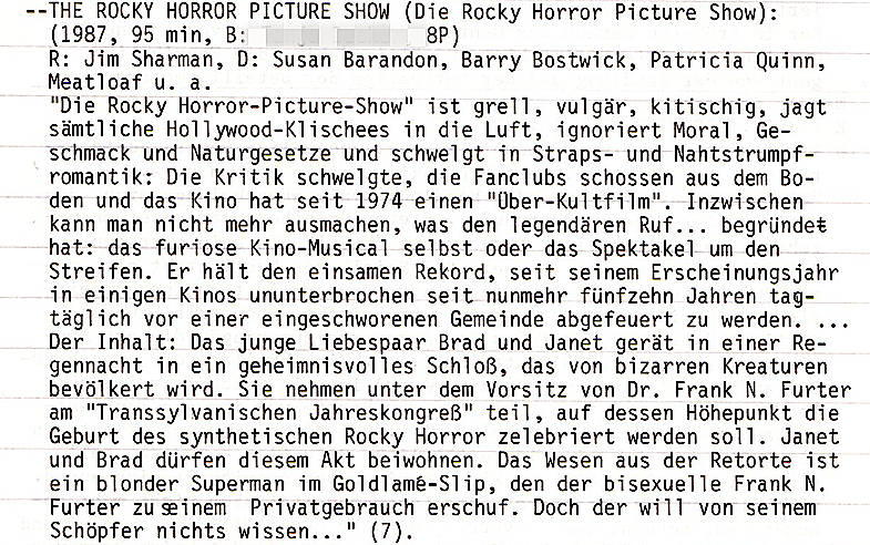 Auch, wie man den Kult feiern kann, steht ausführlich auf der Wikipedia-Webseite zum Film. Mir hat der Film zumindest in der Kinoatmosphäre wohl gut gefallen. Kürzlich wollte ich ihn noch einmal anschauen, aber die Aufzeichnung musste dringlicheren Sichtungen weichen. Vielleicht noch einmal im Kino, ausschließen möchte ich das nicht.