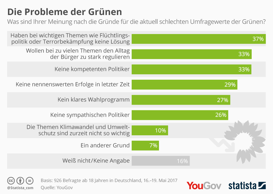 Wir ergänzen den Artikel vom 25.07. nun ein wenig. Die erste Grafik, passenderweise in Grün gehalten, zeigt dne Stand der Grünen vor der Wahl 2017, die sie nur als fünfte Kraft hinter der Union, der SPD, der AfD und der Linken abschlossen. Die Grafik ist insofern tröstlich, als deutlich erkennbar ist, wie die Grünen inzwischen an Profil gewinnen konnten, sie zeigt aber auch verpasste Chancen:
