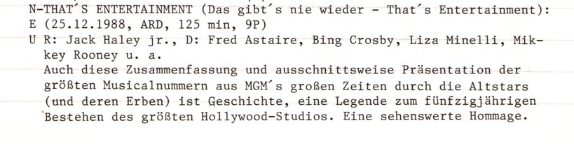 Inzwischen sind fast weitere 50 Jahre vergangen und ich bin gespannt, ob es etwas zum Hundertjährigen des einst mächtigsten Filmstudios der Welt geben wird. Keiner der Stars aus der großen Ära ist noch am Leben, zu einer ähnlich hochkarätigen Moderation kann es nicht mehr kommen, denn nicht nur diese Menschen, die dem Publikum so viel Freude mit ihrem Können bereitet haben, sind Geschichte, sondern auch die Art der umfassenden Show-Ausbildung, die sie repräsentierten. Kein Kinostar ist heute noch in der Lage, auf hohem Niveau gleichzeitig zu spielen, zu singen und zu tanzen.