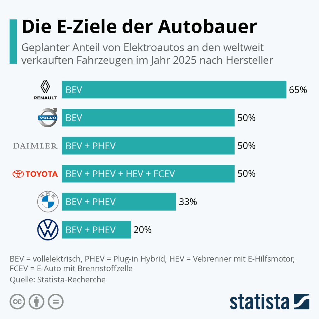 Der Autobauer Daimler hat gestern angekündigt, künftig das ganze Mercedes-Geschäft auf elektrisches Fahren auszurichten. Erstes Etappenziel: Bis zum Jahr 2025 sollen rund 50 Prozent der Neuverkäufe mit vollelektrischen oder Plug-in-Hybriden erzielt werden. Wie die Statista-Grafik zeigt, sind Daimlers Ziele ambitioniert. Derzeit werden sie nur von Volvo und Renault überboten. Bis 2025 werde die Renault Group zehn neue vollelektrische Modelle auf den Markt bringen.
